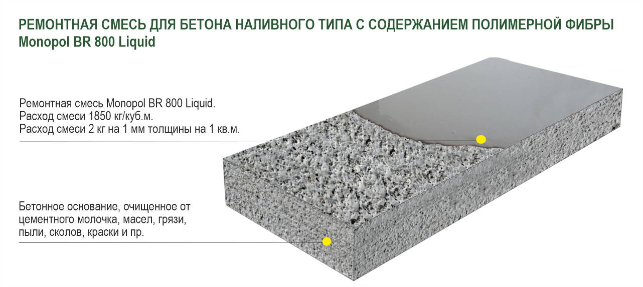 MONOPOL BR 800 Liquid — сухая ремонтная безусадочная быстротвердеющая смесь наливного типа, на основе высокопрочного цемента с нормированным минералогическим составом, фракционированного кварцевого песка и комплекса модифицирующих, минеральных, химических и полимерных добавок. Содержит полимерную фибру.